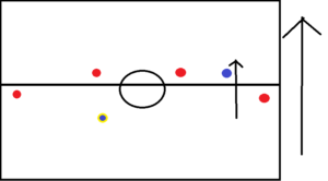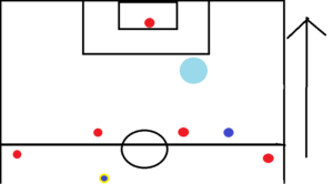 前のパターンは、単純に味方の選手と敵のゴールキーパーの中間あたりでしたが、