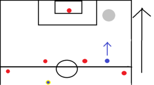 もう一つのパターンで、青い味方の選手が直線的に走って、ディフェンスの裏を走っていく形です。